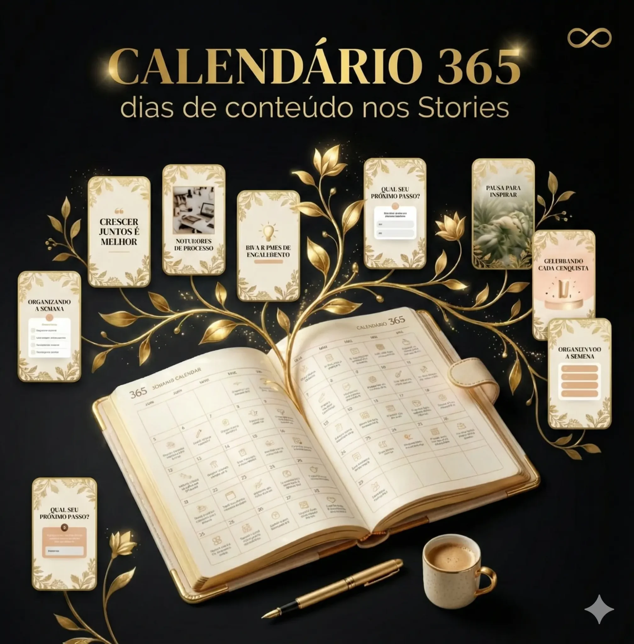 Você tem 365 dias de ideias prontas — uma para cada dia do ano. Chega de bloqueio criativo, de improviso desesperado ou de ficar sumida.